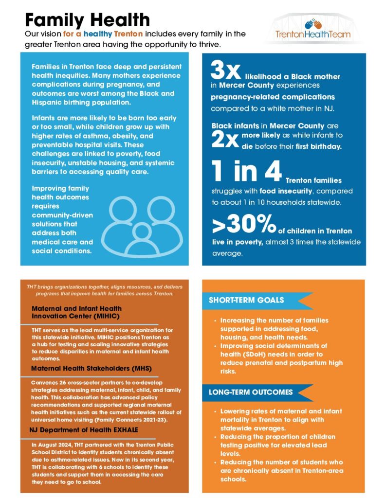 Nuestra visión para un saludable Trenton incluye que todas las familias del área metropolitana de Trenton tengan la oportunidad de prosperar. En Nueva JerseyLas madres negras tienen más del doble de probabilidades de no recibir atención prenatal en comparación con el resto de grupos raciales/étnicos. En todo el país, más de 77% de las mujeres inician la atención prenatal en el primer trimestre del embarazo. En Nueva Jersey, la tasa es de 72% y en el condado de Mercer las tasas de atención prenatal temprana son más bajas, con 63% de las madres del condado de Mercer y menos de la mitad de las madres de Trenton que asisten a una visita prenatal en el primer trimestre (2016).