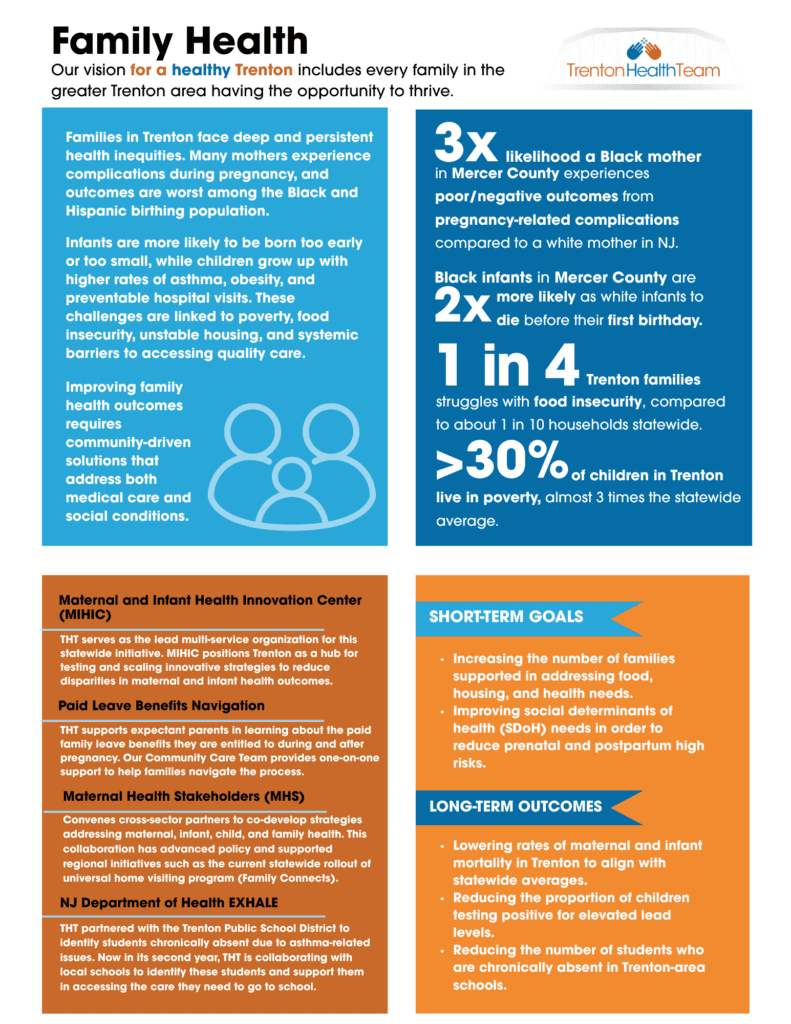 In 2024, THT was chosen as one of the leading organizations behind the soon-to-be constructed Trenton-based Maternal and Infant Health Innovation center where we’ll be connecting families to services that directly impact social determinants of health.